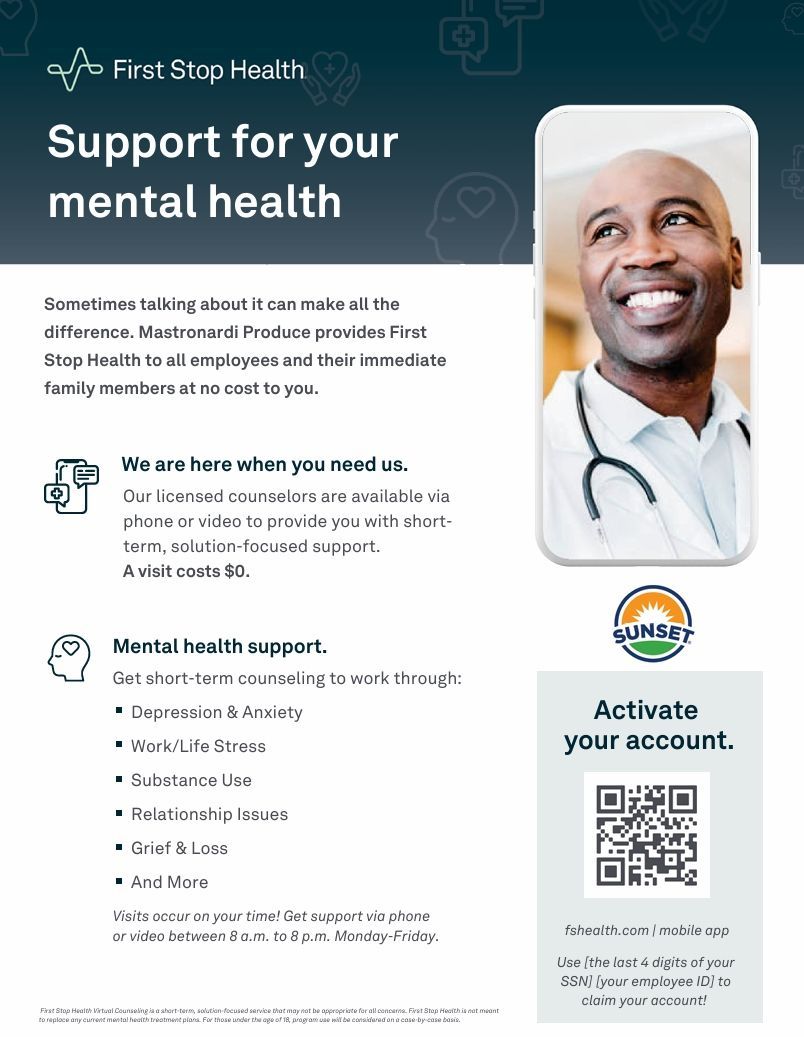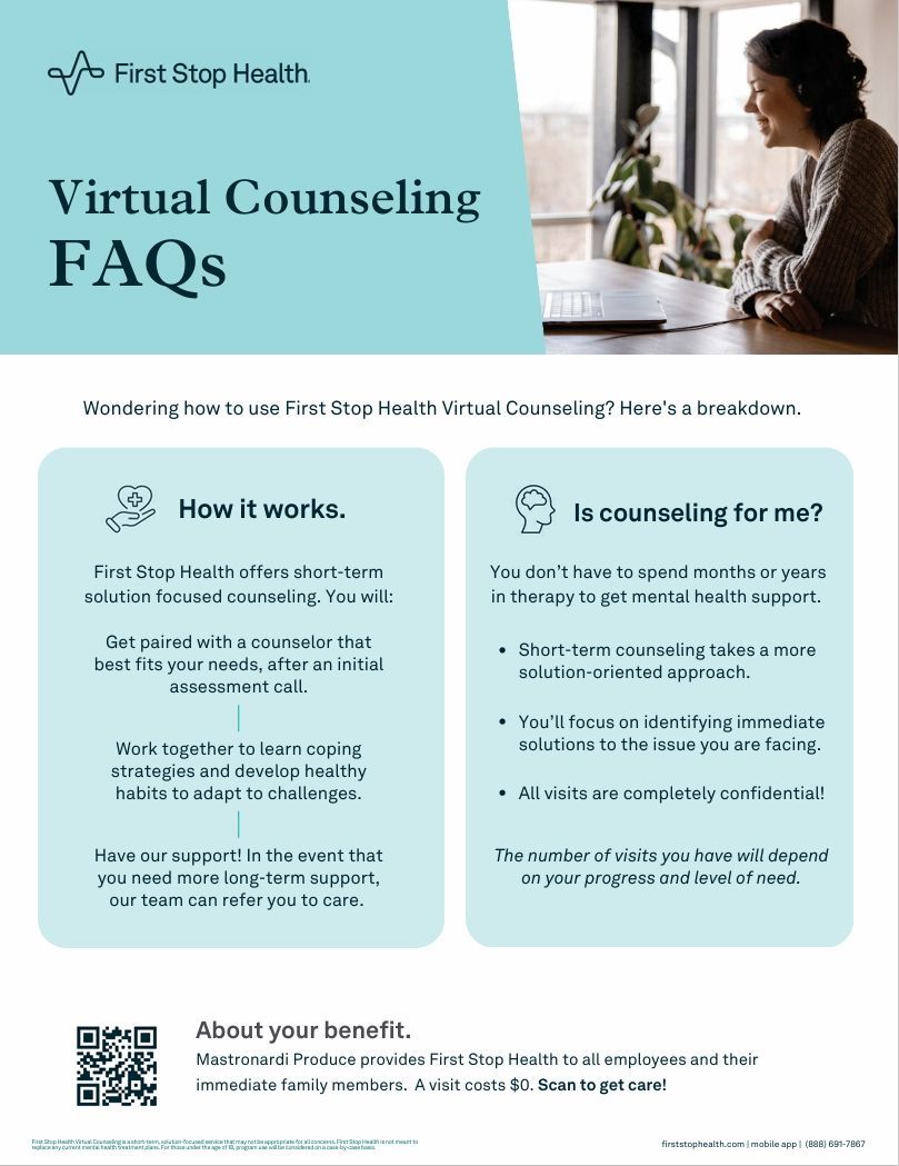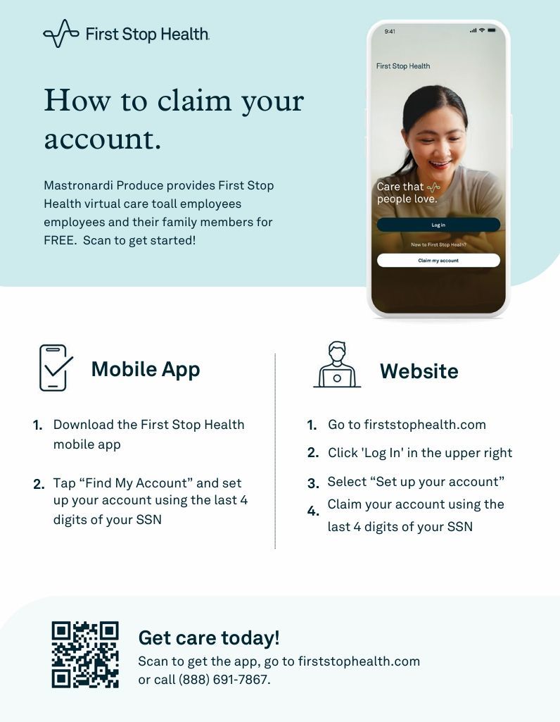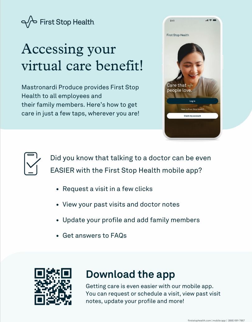 Mastronardi Produce provides First Stop Health to all employees and their immediate family members at no cost to you.